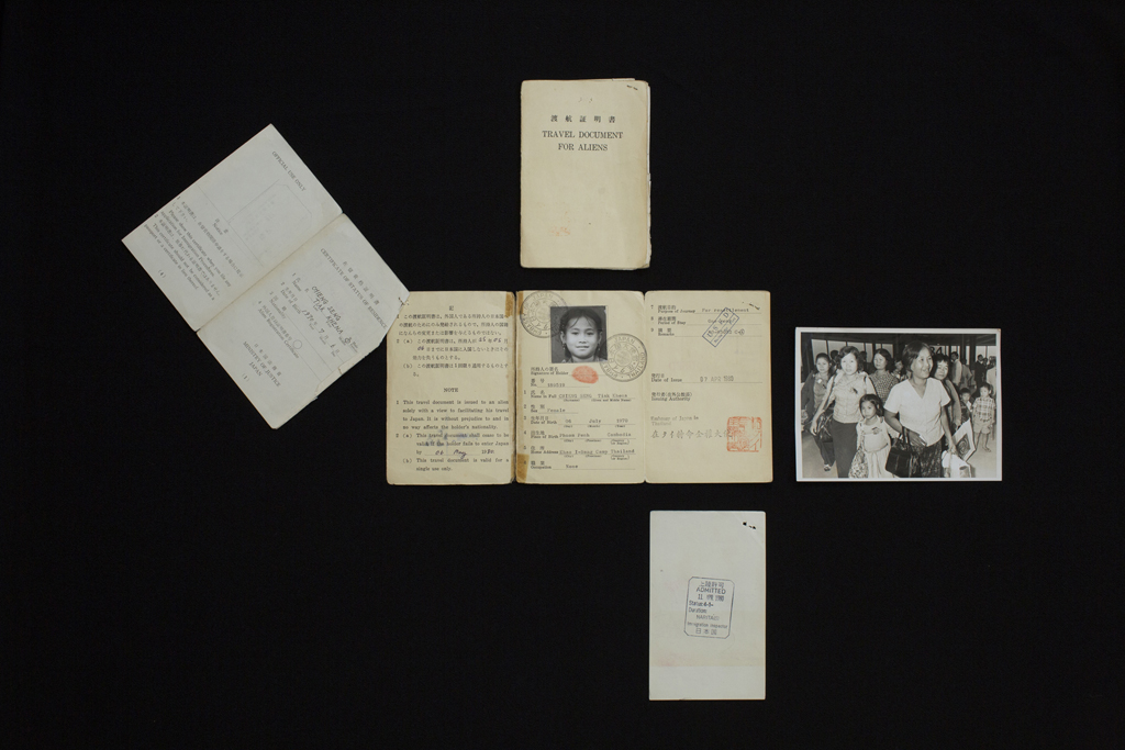 Artist Kim Hak worked with Japan's Cambodian community on this project. TRAVEL DOCUMENT FOR ALIEN AND GROUP FAMILY PHOTO AT NARITA AIRPORT. Photograph by Kim Hak.