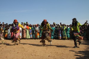 In Tsabango (Nanjiri Area) performers wear pink robes, surrounded by their fellow villagers. Photograph by Ingrid Ytre-Arne.